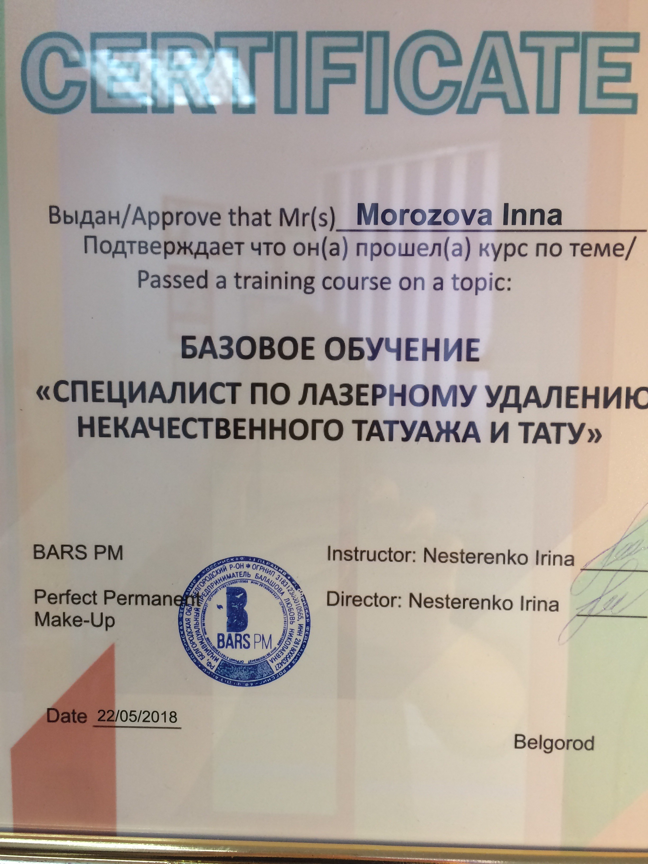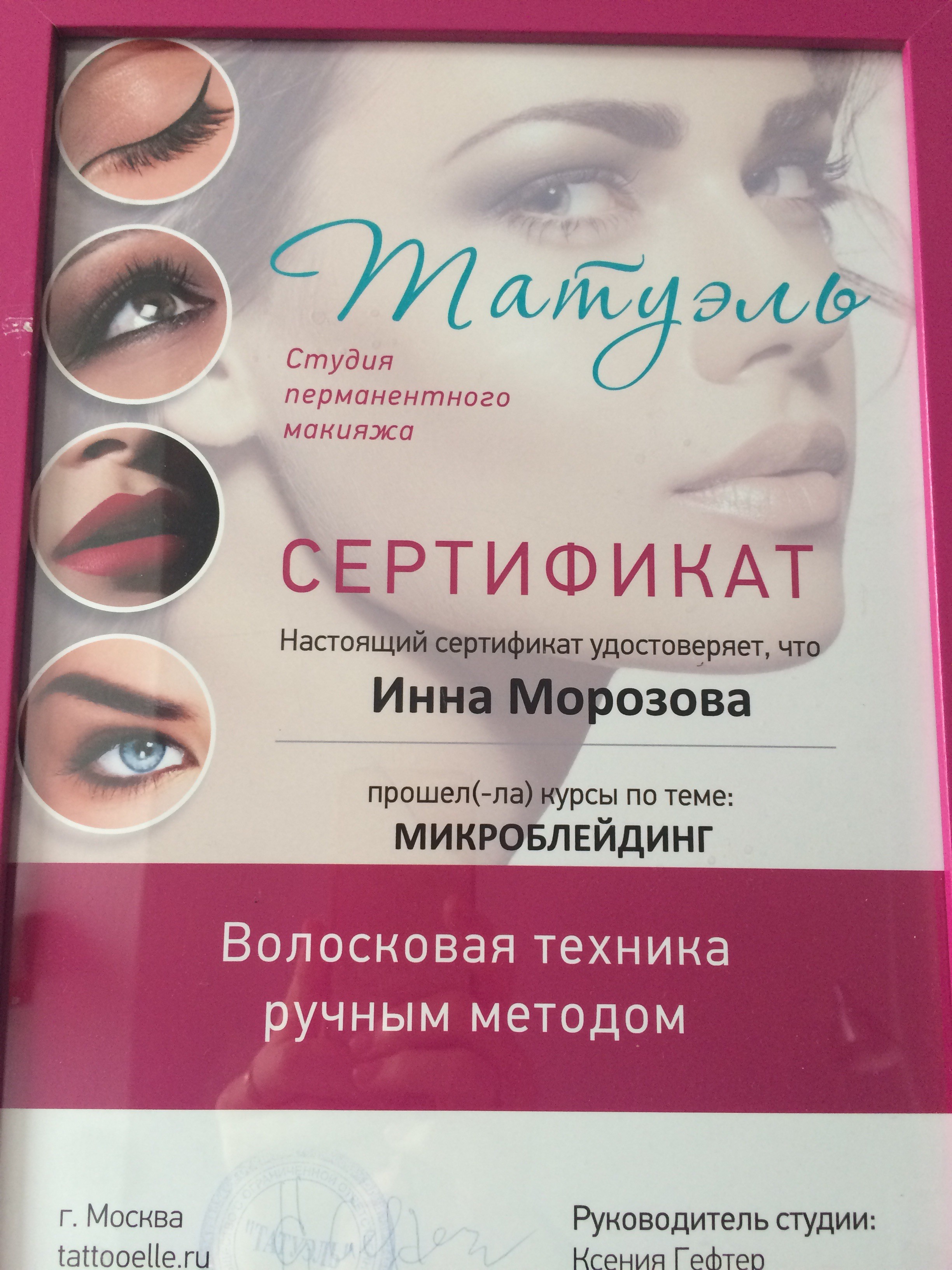 Меня зовут Инна. У меня художественное образование. Я Сертефицировнный специалист по перманентному макияжу и удавлению некачественного татуажа и татуировок. Предоставляю услуги татуажа как в апапаратной техники, так и в мануальной, Архитектура бровей, ламинирование ресниц. Удаление перманентного макияжа и тату, неодимым лазером, без боли. Работаю только одноразовыми расходниками, сертифицироваными материалами. Люблю свою работу, люблю дарить красоту. Красота спасёт мир. Стараюсь чтоб каждое лицо было индивидуальным. Помогаю избавиться от нежелательного татуажа.